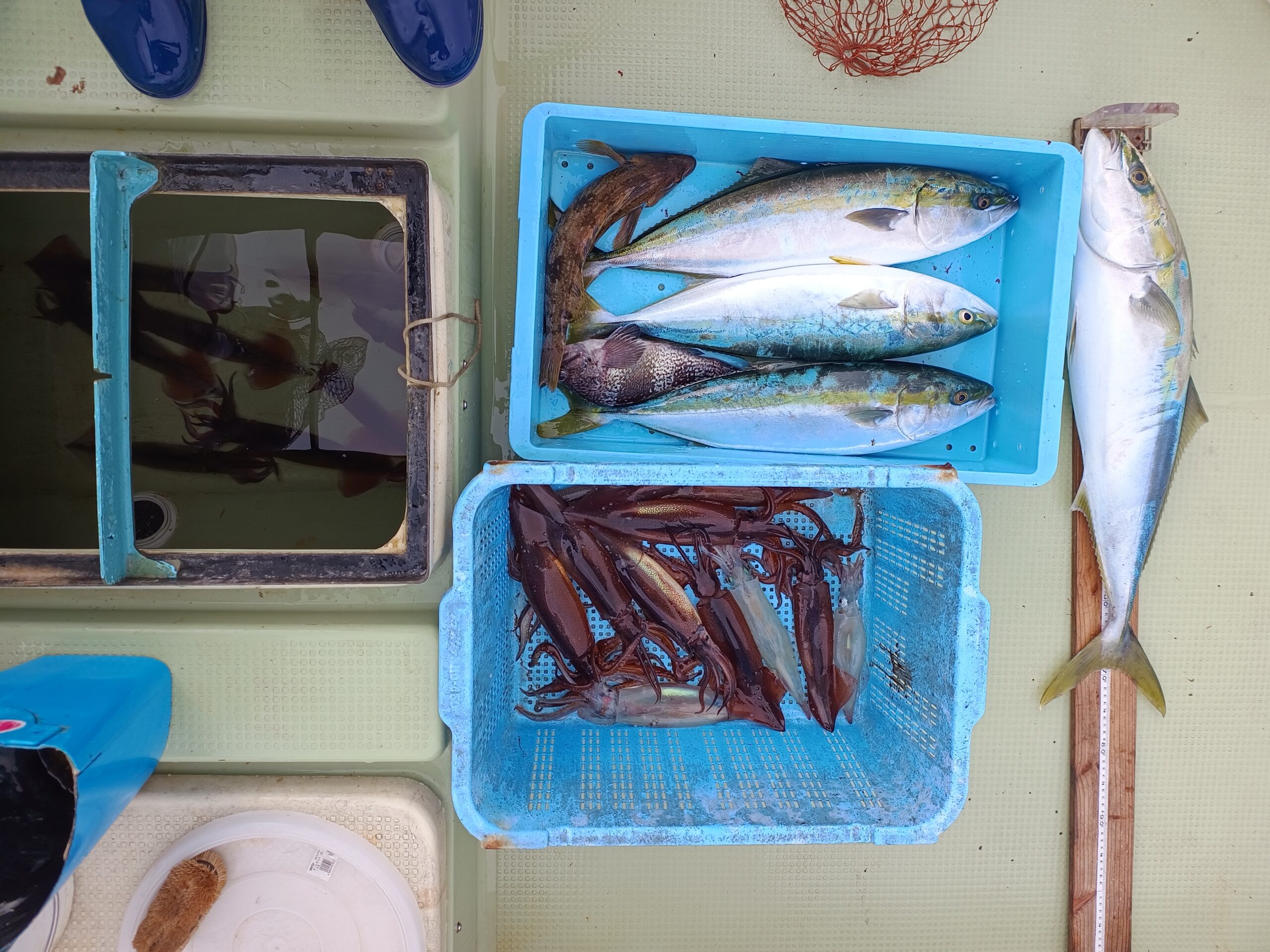 今日は友人と二人。朝ヤリイカを釣りその後青物メインでジギング・・ワラサ数本にソイ・カサゴ・アブラメ等混じれば嬉しいなと出かけました。まだ少し暗いなか湾口を出ると少し波が高いようなのでO根まで行けるかなと思いましたが今日は風は強くならないような予報でしたのでそれを信じて先ずはイカ釣りに・・ 出だしはスルメイカが数本釣れましたが狙いのヤリイカがなかなか来ません。6時半過ぎたくらいで待望のヤリイカが乗りその後ポツリポツリと来ましたが7時を過ぎてすっかり明るくなり殆ど乗らなくなりましたのでここで終了!! 二人でヤリイカを9本、スルメイカを15本と晩のおかずには十分なイカ釣りでした。 ジギングは始めて直ぐに60cmあるかないかのサイズが1本来ましたがその後が続かず数か所期待のポイントを回りましたがアタリもありません。土曜日にはO根で少し良いサイズがきたらしいのでそれを狙って沖に向かいました。1時間ほどいろいろ攻めましたがアタリも無いので諦めてまた岸寄りのポイントへ向かったら最初の所で直ぐにヒット! その後も時間は空いていますが2本釣れて合計4本で時間となり終了。水温も13度台になって年内には青物は終了ですねえ! 今日は風もさほど吹かないのに何処も三角波のような波で釣りづらいなかお疲れ様でした~(^O^)...