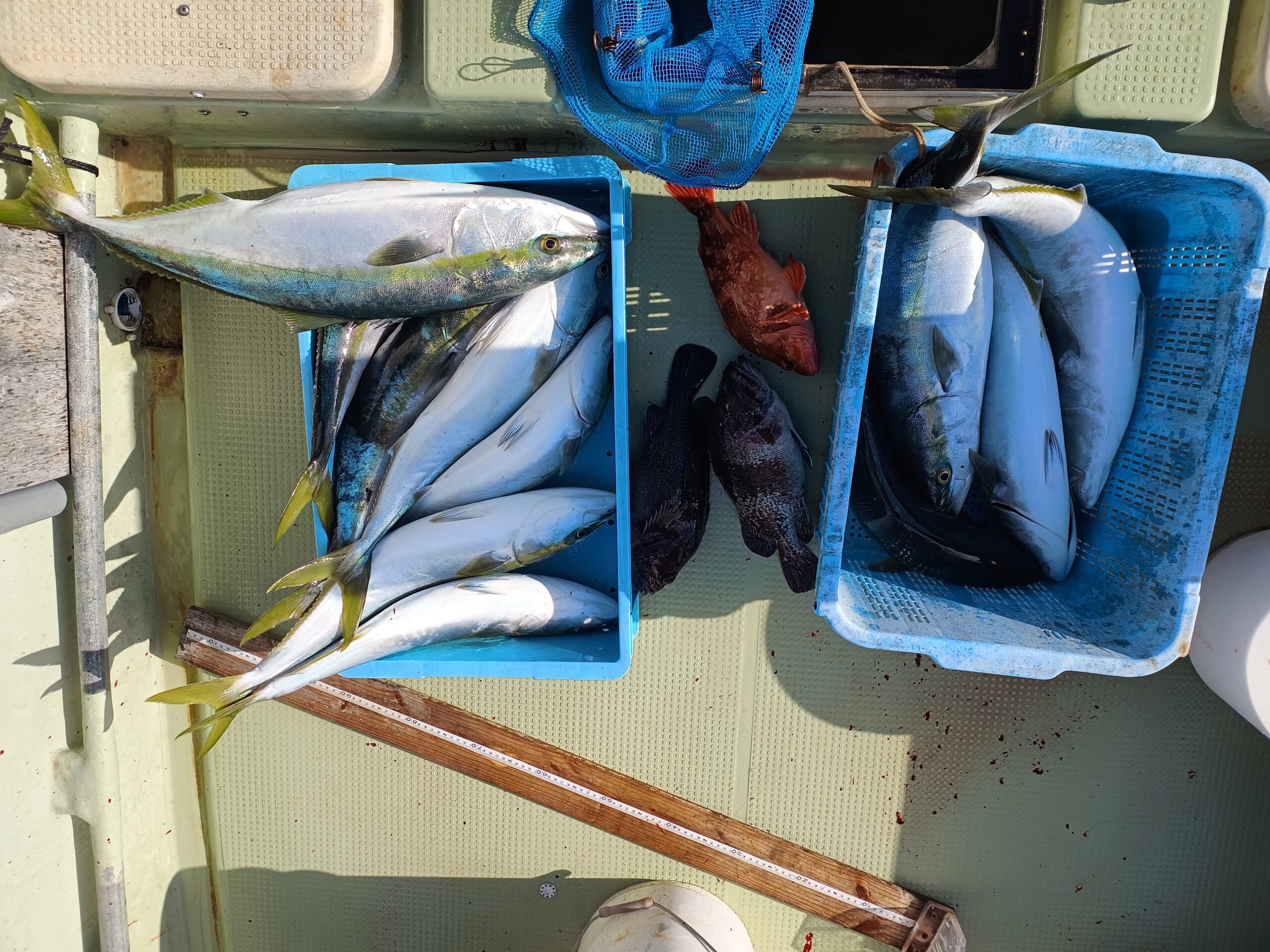 今まで釣れたワラサなど捌いた時に中からにイカが結構出て来るのでそろそろ釣れるかな~と思い少し早めに出てイカ釣りをはじめたら仕掛けを下ろして直ぐに30cmちょっとのヤリイカが乗りその後もポツリポツリと揚がりトータル8本のヤリイカと小さいスルメイカが2本揚がりました。これからどんどん大きくなって来るイカに期待して初物のヤリイカ刺身をいただきたいと思います。青物も2~3か所1時間ほどやって殆ど反応が無かったので沖に出たら結構反応が良くて下ろして直ぐに2本、その後もポツリポツリと当たり途中でバレて逃がしたり、リーダーが切れたりヒット数は15~20回くらいありましたので今月中くらいは何とかワラサ狙いはできそうです。あとソイやカサゴも夏場に比べてけっこう良くなってきた感じですので期待しています。お客様がアブラメを釣りたいと言っていたのでそれだけが残念かな~ まあとにかく65過ぎの高齢者には1日竿を振り回すジギングはやや疲れますね~(>_<)