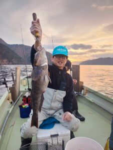 遅ればせながら日曜日の午後船の釣果情報です。アワビの口開けになってしまい時間の変更をお願いしたところ午後でも良いと言う事で午後2時の出港で少しジギングをやってその後イカ釣りに変更と言う流れでした。ジギングの方は水温が下がったためか青物は殆ど乗らなくなりました。10月までと違い何処に行っても釣れるわけではなく魚探のベイトの反応が良いような所のみ乗る程度です。最後のチャンスと80m程度の深場で良い反応が出た場所で2人同時にヒット! 1人は60㌢ほどのワラサ。もう1人は47㌢ですがものすごい太いアブラメで2キロ位ありました。ジギングは終了してイカ釣りに変更しましたがなかなかお目当てのヤリイカが乗らずたった1本のみで場所を2か所ほど変えて定置網のそばで灯りを点けてはじめたら35cm位はある大きいスルメが乗りだしてそのうち灯り目指して船に飛び込むスルメが何本かあって…なんだかんだ最終的に4人で65本ほど釣れました。(^_^)