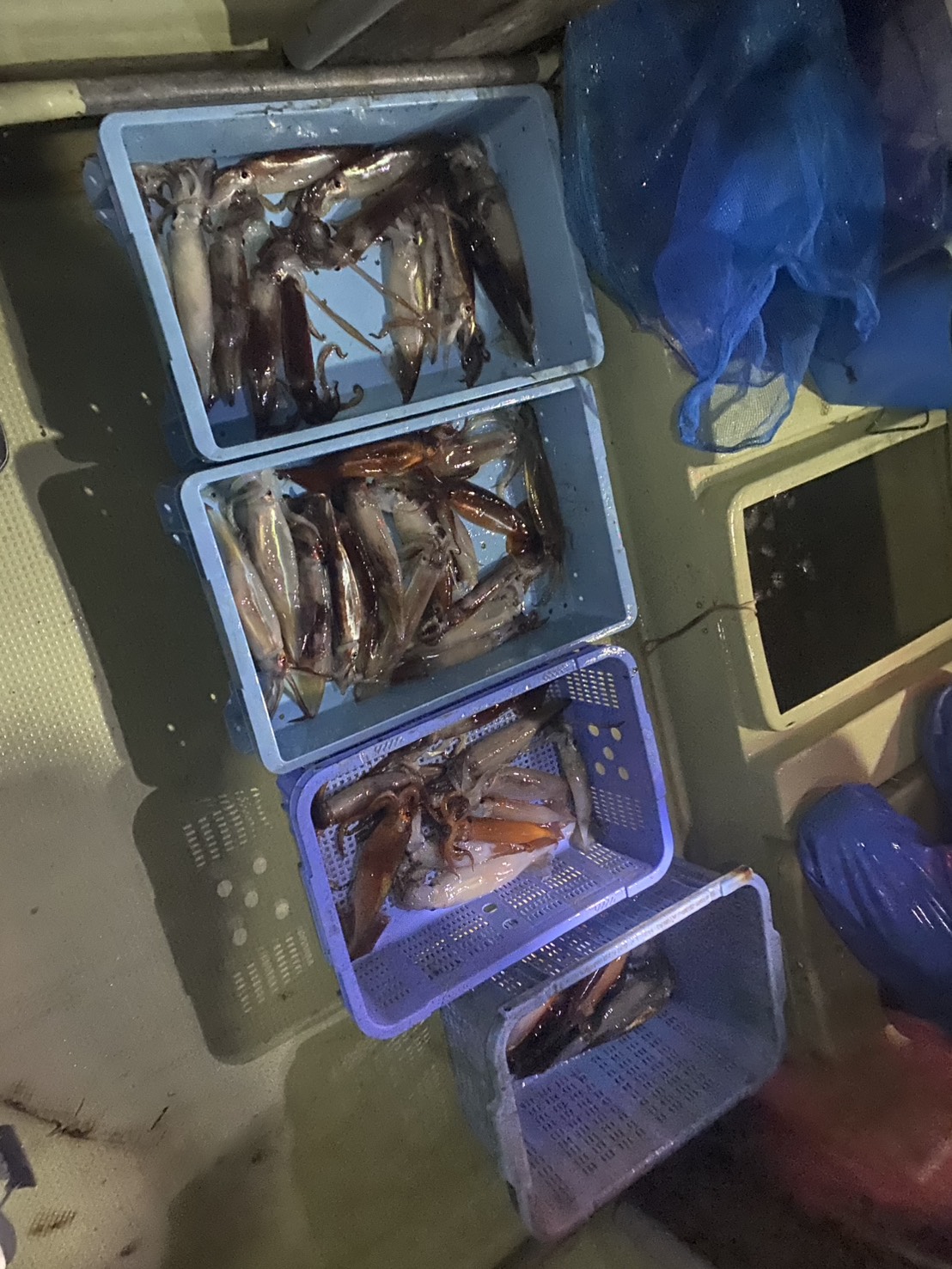 遅ればせながら日曜日の午後船の釣果情報です。アワビの口開けになってしまい時間の変更をお願いしたところ午後でも良いと言う事で午後2時の出港で少しジギングをやってその後イカ釣りに変更と言う流れでした。ジギングの方は水温が下がったためか青物は殆ど乗らなくなりました。10月までと違い何処に行っても釣れるわけではなく魚探のベイトの反応が良いような所のみ乗る程度です。最後のチャンスと80m程度の深場で良い反応が出た場所で2人同時にヒット! 1人は60㌢ほどのワラサ。もう1人は47㌢ですがものすごい太いアブラメで2キロ位ありました。ジギングは終了してイカ釣りに変更しましたがなかなかお目当てのヤリイカが乗らずたった1本のみで場所を2か所ほど変えて定置網のそばで灯りを点けてはじめたら35cm位はある大きいスルメが乗りだしてそのうち灯り目指して船に飛び込むスルメが何本かあって…なんだかんだ最終的に4人で65本ほど釣れました。(^_^)