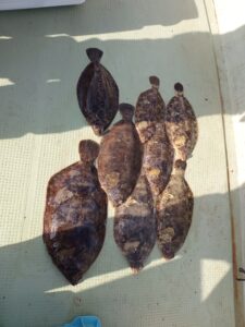 正月明け最初のお客様ですので大漁してもらいたいのですがどうなるか? 最初に付けた場所では反応が悪くヒガレイがポツリ、小ぶりなナメタがポツリとイマイチなので何ヵ所か場所を変えましたが、潮回りが悪いのかナメタの機嫌が悪いのか中盤過ぎてもはナメタガレイ3枚のみ。ここでダメなら行く所がないと望みをかけて仕掛けを下ろしたら少しずつナメタが揚がりだしヒガレイもポツポツ揚がり何とかナメタガレイが最大49cmで40cm前後も4枚とまあまあの釣果で終わる事ができました。最後の1時間半くらいはけっこう強い風が吹いたので少し風が止んだ所を見て帰ろうかなと思いましたが止みそうが無いので終了して帰還となりました。写真の通りナメタガレイ8枚ヒガレイもまあまあの釣果で終了となりました。N様風で釣りずらい中ご苦労様でした。